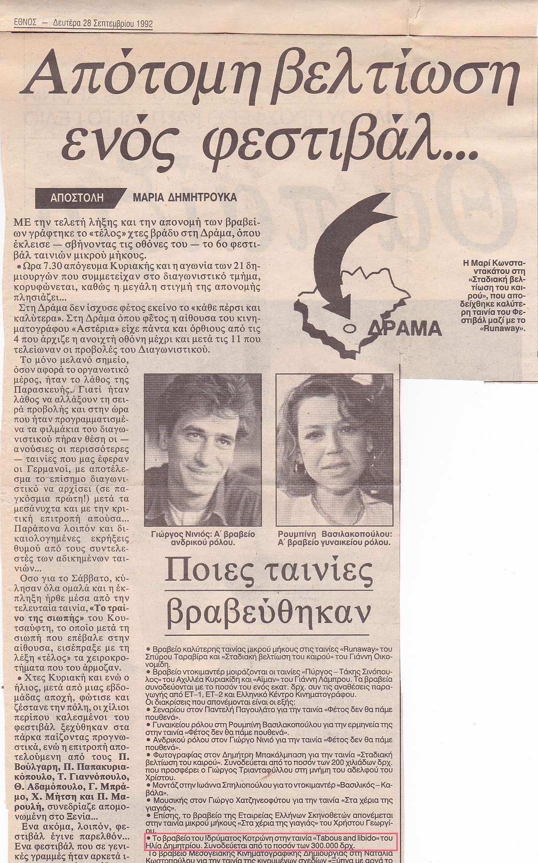 Κείμενα και Κριτικές Έθνος (28/9/1992) Δείτε το αρχείο σε μεγάλη διάσταση Ανταπόκριση της Μαρίας Δημητρούκα για την εφημερίδα"Έθνος" (28/9/1992) Σχόλια