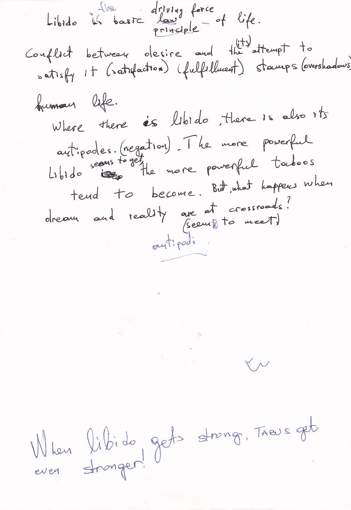 Κείμενα και Κριτικές Χειρόγραφο του Ηλία Δημητρίου Δείτε το αρχείο σε μεγάλη διάσταση Προσπάθεια από τον Ηλία Δημητρίου για τη συγγραφή της σύνοψης της ταινίας "Tabus und libido" στα αγγλικά Σχόλια